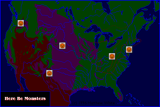 So let's take another look at at the "Here Be Monster" category. The only published article is the Jackalope, itself an easter egg looking at the Nomadic Herdsmen page. You can see the map here, with five overall locations, each a monster, some kind of American Cryptid or folktale creature: Bigfoot, Mothman, The Jersey Devil, and "Roswell", which is what the picture is labelled, it's what the reserved url is, and obviously supposed to be a Space Alien. (It is interesting the location, not the creature is named, and the style of our little Green Man is quite different) When I first started the blog, the younger me was certainly of the "more is more" mindset, posting an article suggesting even more monsters to cover. I haven't walked back on that necessarily, but I do constantly wander back and forth on what America's "Haunted Mythology Canon" should be. The Legend of Sleepy Hollow, the Bell Witch, the Amityville House and perhaps an Edgar Allen Poe story or two should be prioritzed in crafting a core haunted lore for Medieval America.